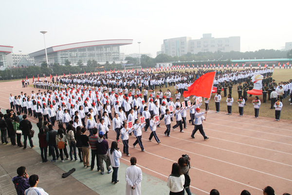 随着李羽副校长宣布运动会入场式开始,在国旗和本届运动会会徽的导引下,校仪仗队、各分院代表队成员迈着自信有力的步伐,精神抖擞地走过主席台。运动员们响亮的口号和形式多样的表演,充分展示了我校学子蓬勃的朝气和良好的精神风貌。