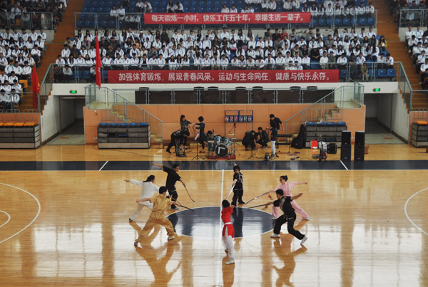 开幕式上,校瑜珈队、排舞队、武术队、健美操队、师生乐队等进行了精彩、生动的节目表演,赢得了现场观众的阵阵掌声。