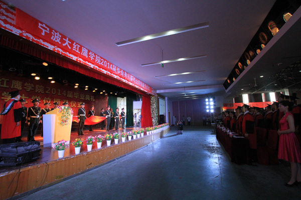 6月7日,我校2014届毕业典礼暨学士学位授予仪式在学生活动中心五楼隆重举行。大厅里红色条幅“自信开启成功之路,专注铸就精彩人生”、“百折不挠,超越自我,不断追求崇高目标”、“挥手道珍重,昂首笑风雨,情留校园里,心系大天地” 高高悬挂,格外醒目。