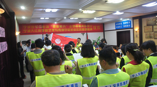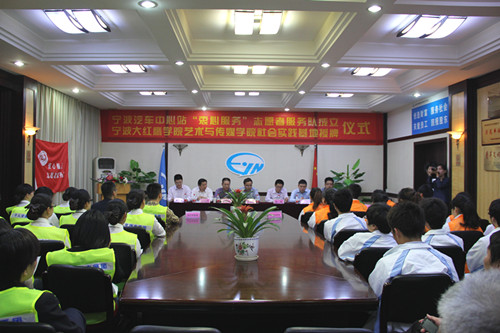 为庆祝“五四”青年节, 5月4日上午,汽车中心站“衷心服务”志愿者服务队成立仪式暨艺术与传媒学院与宁波汽车中心站共建“大学生社会实践基地”授牌仪式在中心站二楼会议室举行。我校艺术与传媒学院、团委和汽车中心站有关负责人以及志愿者代表等参加了活动。