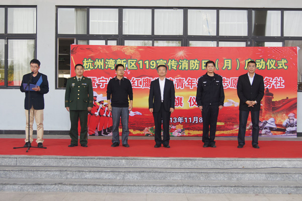 接着,胡守治副主任宣布杭州湾新区119消防宣传日(月)正式启动;俞国清副大队长为我校青年消防志愿者服务社授旗。