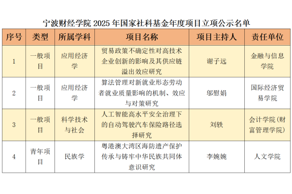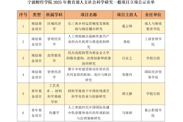 2025年度,学校拟获批立项的国家社科基金年度项目和教育部人文社科一般项目覆盖了多个学科领域,包括应用经济学、科学技术与社会,民族学、教育学、管理学、材料学、新闻学与传播学等。这些项目主要分布于6个学院,展现出学校教师广泛的科研参与度。其中,国际经济贸易学院2项,金融与信息学院、会计学院(财富管理学院)、工商管理学院、人文学院、象山影视学院各1项。各单位结合自身学科特色精准发力,形成 “核心引领、多点支撑、协同共进” 的良好科研格局,为学校后续人文社科领域研究的高质量发展奠定了坚实基础。